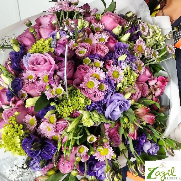 Lindo ramo de flores en tonos morados, como rosas, lisianthus, margaritas, alstroemerias, hortensia verde.